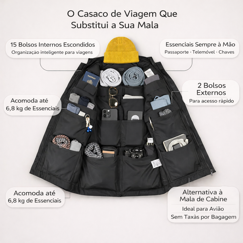 Leve até 7 kg de roupa, tecnologia e objetos pessoais distribuídos por 15 bolsos interiores, mantendo tudo organizado e evitando malas adicionais.