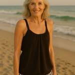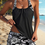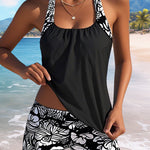 Este conjunto tankini combina conforto e estilo com um top solto, sem mangas, que disfarça suavemente a barriga e a cintura. O tecido elástico e de secagem rápida acompanha os seus movimentos, enquanto os calções oferecem liberdade total. A estampa floral preta e branca, intemporal, cria um visual elegante – perfeito para mulheres que querem sentir-se confortáveis e femininas.