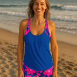 Este tankini casual oferece confiança e conforto ao mesmo tempo. A mistura macia de algodão é agradável ao toque, enquanto o decote em U e as costas abertas destacam sutilmente a feminilidade. O top soltinho disfarça barriga e quadris sem esforço. Perfeito para dias relaxados na praia, com um visual fresco e moderno.