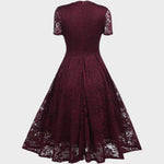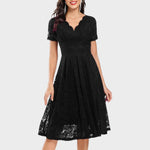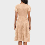Este vestido é feito para momentos importantes. Com o seu lisonjeador decote em V, delicada sobreposição de renda floral e silhueta em A fluida, é ideal para casamentos, festas de cocktail e noites elegantes. As mangas curtas acrescentam um toque de sofisticação, enquanto os pormenores com vieiras o tornam chique sem esforço.
