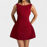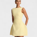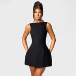 Este vestido curto une elegância e modernidade com um corte limpo e sofisticado. O design sem mangas e o decote discreto valorizam a silhueta de forma subtil, enquanto a estrutura do tecido oferece um caimento impecável.