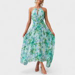 Com uma estampa floral que exala frescor e feminilidade, este vestido longo traz um ar romântico e sofisticado na medida certa. O decote halter valoriza os ombros e o busto com elegância, enquanto a cintura marcada e a saia fluida criam um visual leve e encantador. Perfeito para dias ensolarados, festas ao ar livre ou passeios à beira-mar.