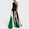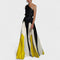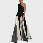 Este vestido longo de um ombro só combina sofisticação escultural com uma estética contemporânea e ousada. A parte superior em tecido liso abraça o corpo com fluidez, enquanto a saia plissada exibe recortes gráficos e contrastantes que criam movimento e impacto visual a cada passo. Uma peça feita para mulheres que desejam marcar presença com arte e classe.