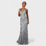 Este bonito vestido até ao chão com pormenores de lantejoulas foi feito para impressionar. A silhueta justa acentua elegantemente as suas curvas, enquanto as lantejoulas brilhantes dão um toque de luxo. O decote em V profundo e o corte sofisticado tornam este vestido ideal para galas, casamentos e eventos formais onde quer brilhar.