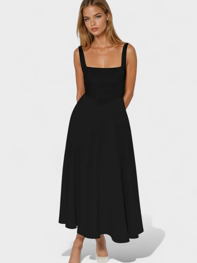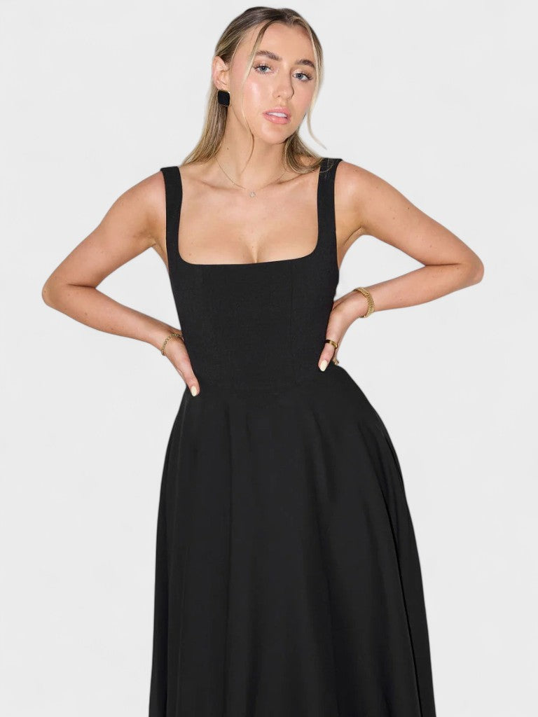 • Silhueta valorizada - O corpete ajustado e o decote quadrado estruturado desenham e valorizam a cintura, enquanto a saia ampla equilibra proporções para um look harmonioso.